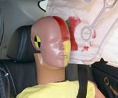 Measures taken from the neck, chest, and both legs indicate low risk of injuries to these body regions in a crash of this severity. A high head acceleration occurred when the dummy's head hit the steering wheel through the airbag, indicating that head injuries would be possible.